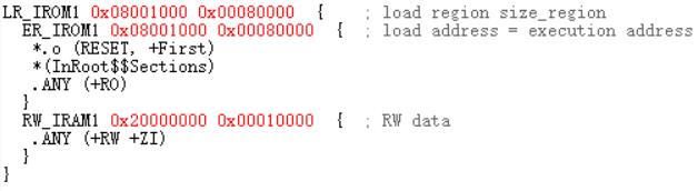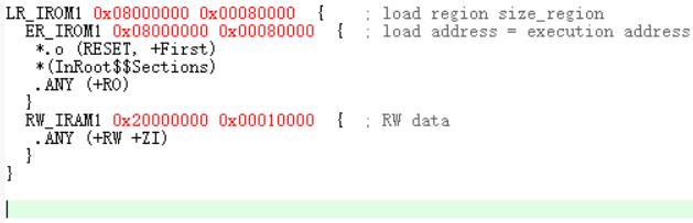 加载域地址从0x08000000地址开始,大小为0x80000(512KB),运行域(RO)从0x08000000开始,运行域(RW+ZI)从片内SRAM地址开始0x20000000。