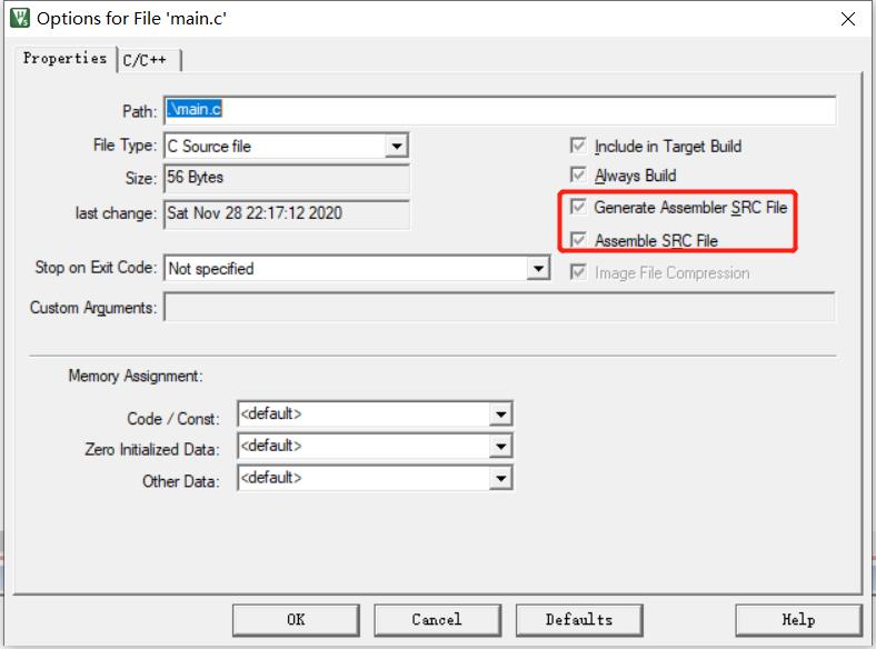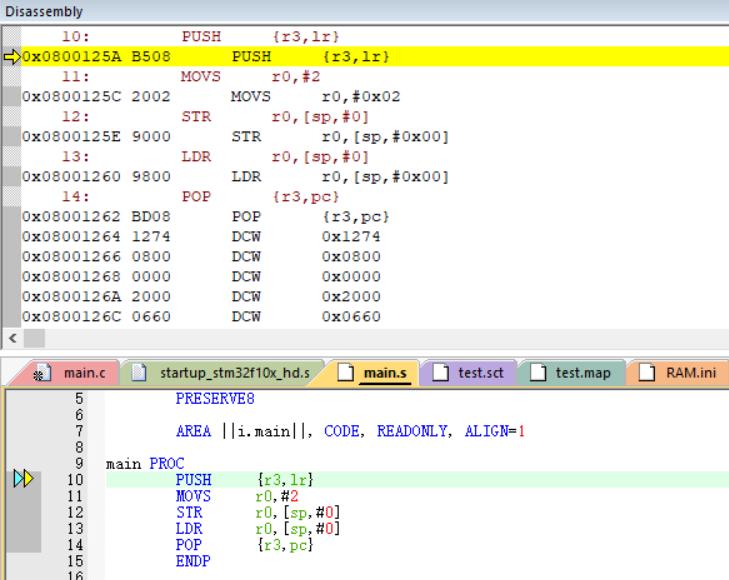 上面Debug之后光标默认是在反汇编窗口里面,是因为我们勾选了下面的两个勾,点击它们,变成灰色就可以停在main.c文件里了
