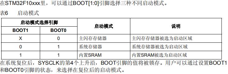 有的同学可能会问,《Cortex-M3权威指南》里面不是说上电从0地址开始依次取两个值赋给SP和PC吗,为什么这里会从0x08000000开始呢?这是因为STM32F1有2个boot引脚,接不同的电平的时候会把不同的地址映射到0地址上,如下表: