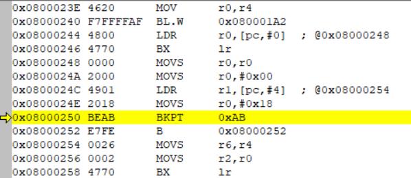 由上面的STM32上电时地址映射机制可知,由于此时地址空间的0地址是映射到0x08000000的,我们虽然修改了分散加载文件把程序放到了0x08001000,但是上电时还是会从0x08000000处开始取SP和PC,所以应该是不能正常运行的,我们跑一下看看: