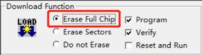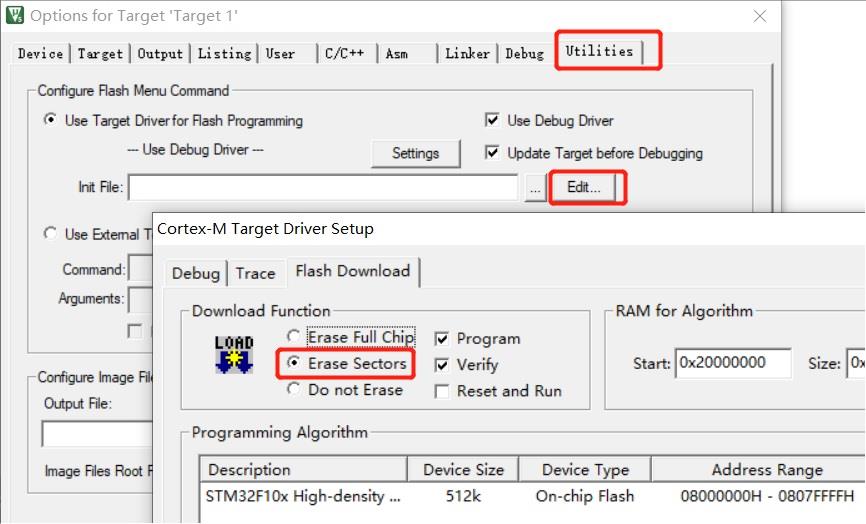 可以看到程序停在了0x08000250这个地址,显然这个地址并不属于我们的程序,但是这里为啥会存在正常的指令?因为我们在flash下载设置里面设置了Erase Sectors,如下图,这意味着在下载程序时只擦除需要擦除的区域,也就是说只会从0x08001000处开始擦除,而0x08000000~0x08000FFF区域保持不变,也就是我们上次所烧的程序。
