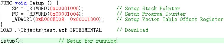 这里简单解释下这个ini文件的意思:FUNC的意思是定义一个函数,Setup()是对应的函数,内容大家都看得懂,直接给MSP以及PC赋值,然后写0xE000ED08(VTOR寄存器)地址,告知MCU地址启动地址改变了,最后一行代码的意思是调用Setup()函数。然后把写好的ini文件放到刚才的位置上,如下图: